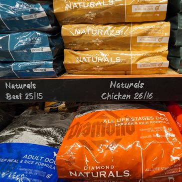 We stock ValuPak and Diamond Pet dog foods, as well as limited quantities of Diamond Naturals. We also carry shampoos/dips, bowls, leashes, collars, harnesses, and custom-made brass collar tags.
